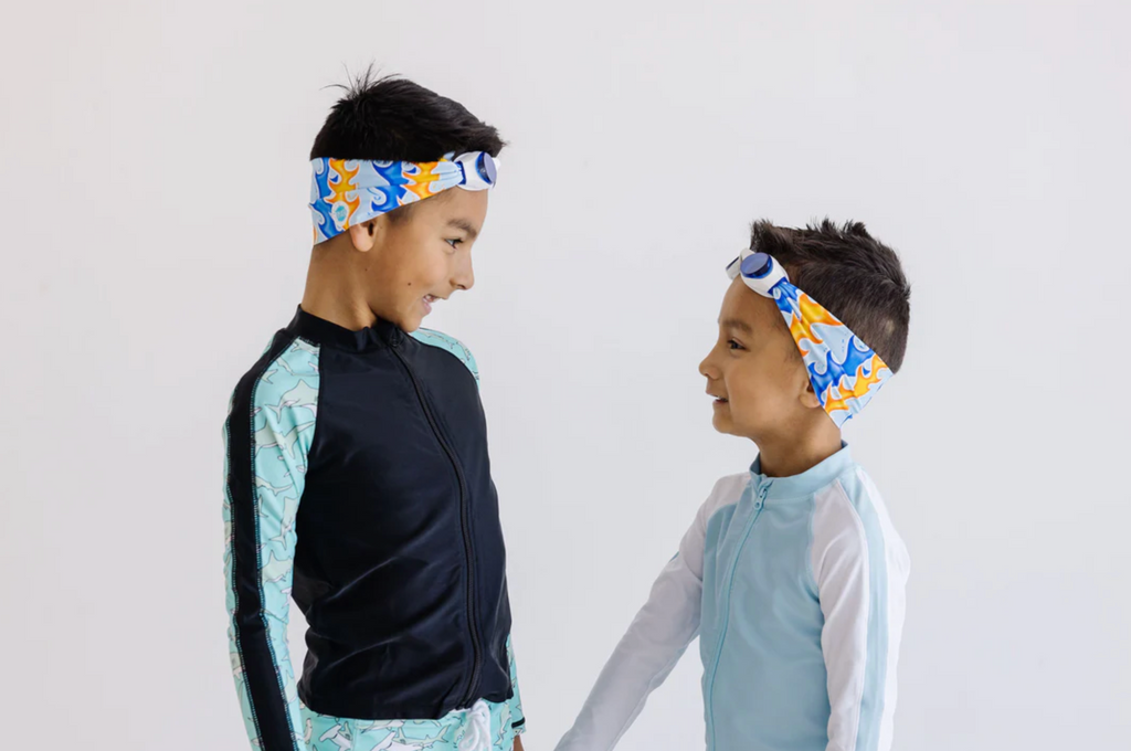 Our Blaze swim goggle features our tangle-free strap in a blue and orang flame print on a light blue background paired with white frames and lightly tinted blue lenses.