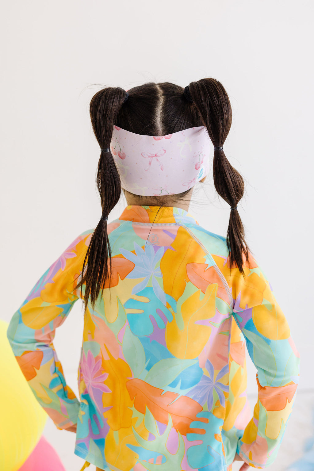 Our Cherry swim goggle features our tangle-free strap in a soft pick with cherries and bows. Paired with a white frame and lightly tinted pink lenses.