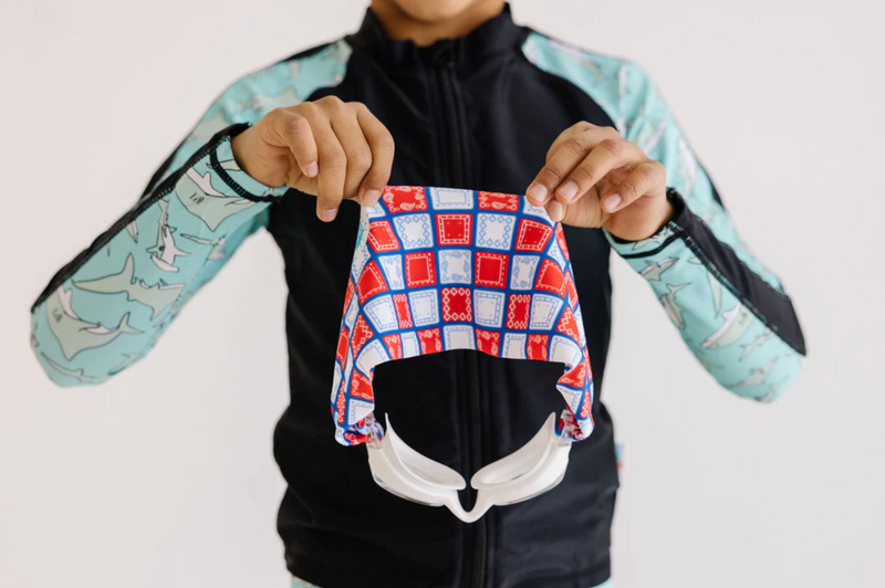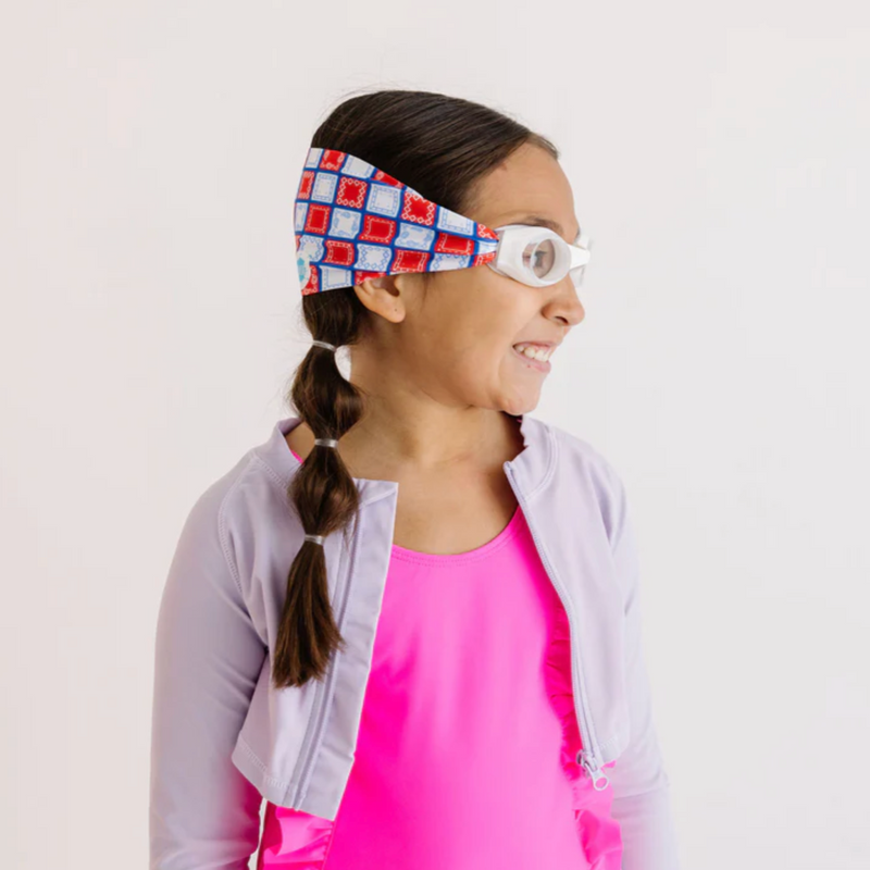 Our Giddy Up swim goggle features our tangle-free strap in a paisley red, white and blue print. Paired with a white frame and clear lenses.