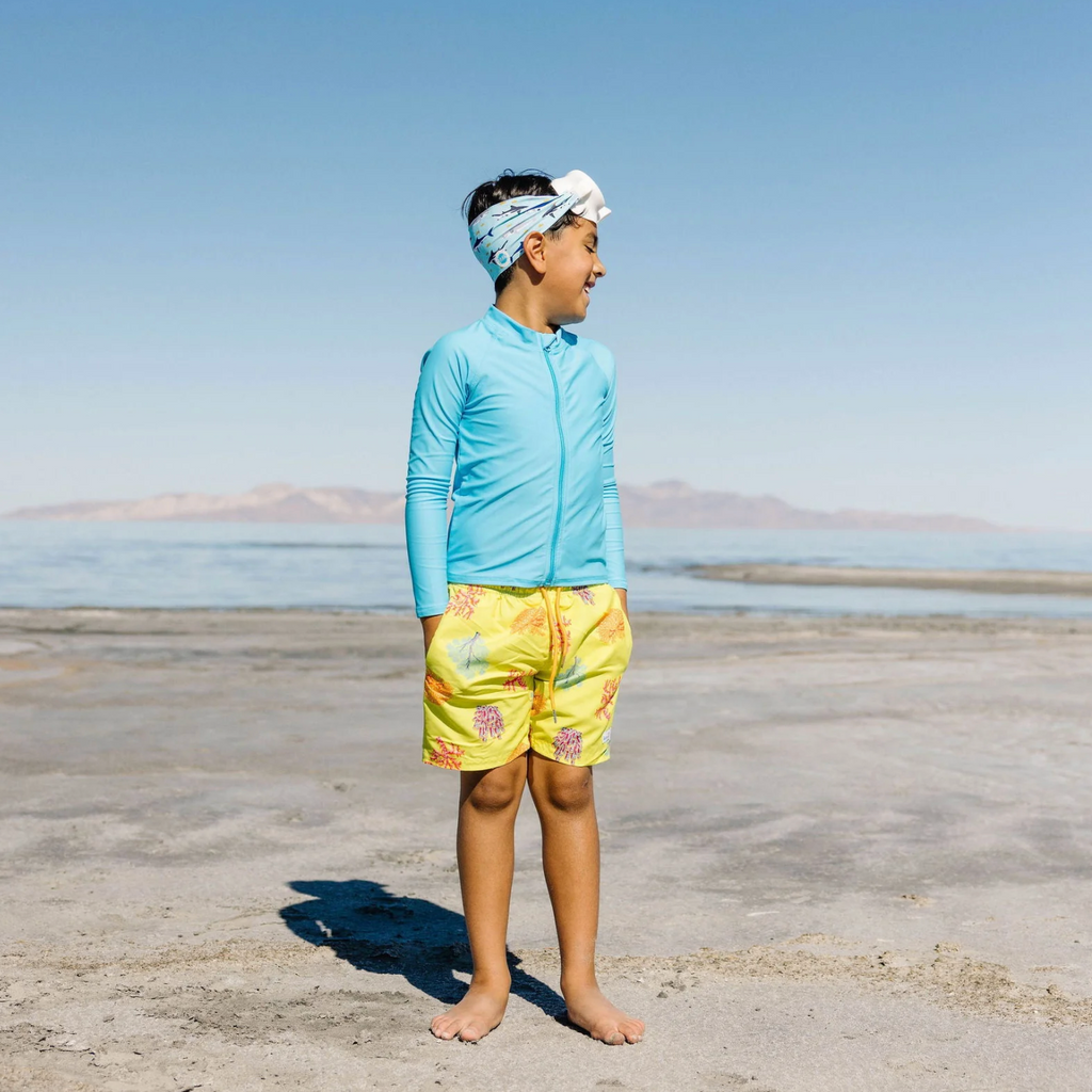Our Shark Attack face mask swim goggle features our tangle-free, patent-pending strap in a shark print on a bubbly blue background. Paired with a white frame and clear lenses.